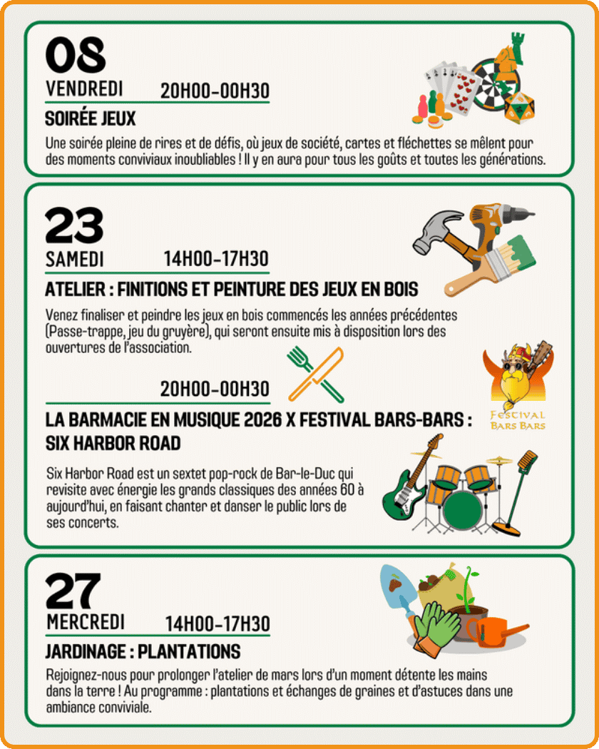 - la Barmacie en musique & le Festival BARS-BARS, avec le concert SIX HARBOR ROAD le samedi 23 mai à 20h!